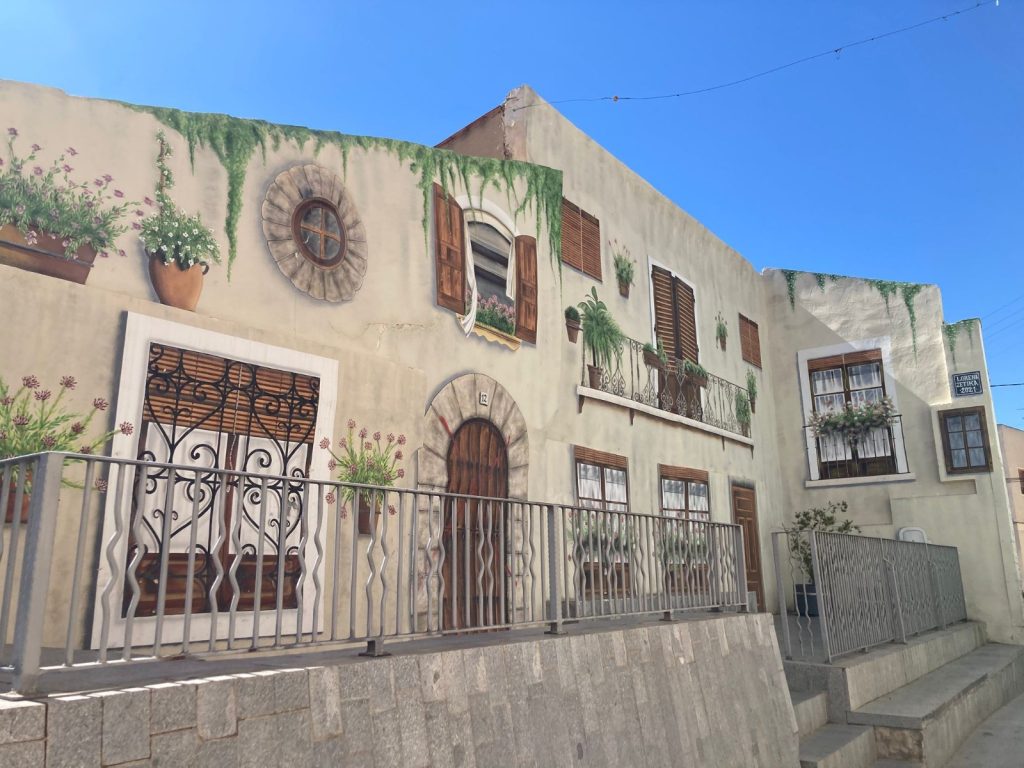La ermita de San Blas con su forma y su color tan propios, está al lado de un graderío que cubre la base de la peña por este lado. El castillo se asoma por encima. Hace un momento estábamos ahí en lo más alto de todo, pensamos. Al bajar, un precioso trampantojo nos alegra la vista.