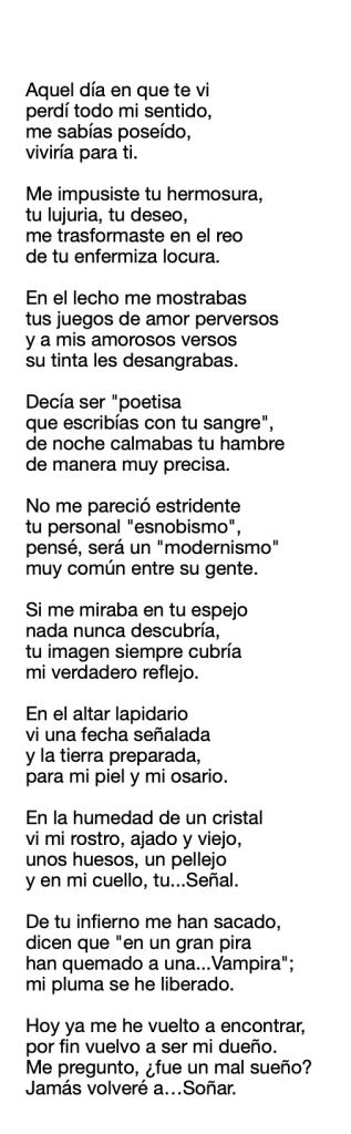A veces me dejo arrastrar por mi fantasía poética a lugares extraños, surrealistas, que poco o nada tienen que ver con mi manera de vivir, y conozco personas muy diferentes, y me enamoro de personajes que no existieron, ni existen ni existirán, ¿o sí? , en mi mundo real, pero la poesía invita a entrar en ese lado oscuro o inframundo, donde la muerte reina, y lo hace para comprobar si una pluma poeta es capaz de versar allí, donde el poeta y la poetisa no existen.