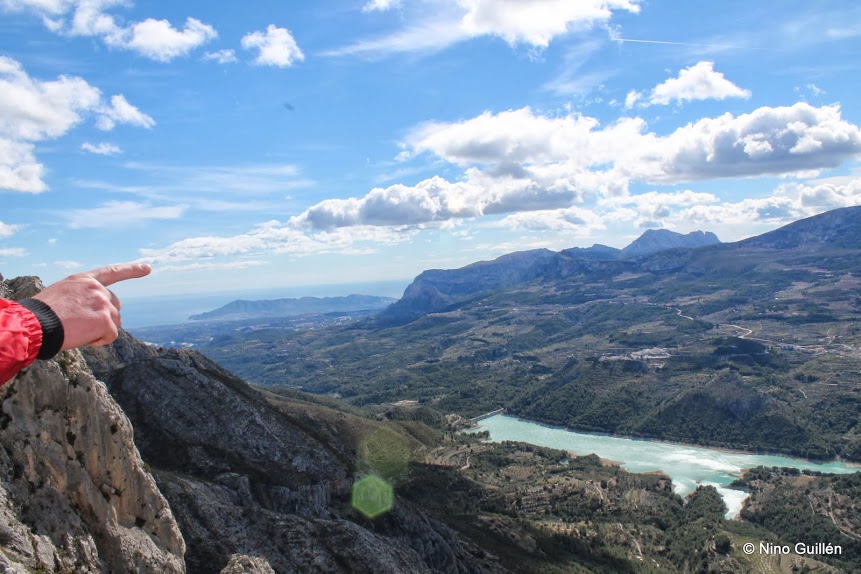 Nos acercamos al borde del acantilado y la visión del valle que se muestra ante nosotros es sobrecogedora. Vemos el Mar Mediterráneo, Serra Gelada, el Rincón de Loix, el embalse a nuestros pies, Aitana enfrente… nos quedamos extasiados en silencio. El castillo se encuentra en término de Castell de Castells: estamos en el castillo de Castell de Castells y por la grandeza de su ubicación entendemos que se pueda denominar así esta población, que fue subencomienda de la Orden de Calatrava, sujeta a la Encomienda de Bejís (Castellón), lo que es visible en los grilletes y la cruz calatrava del escudo municipal.
