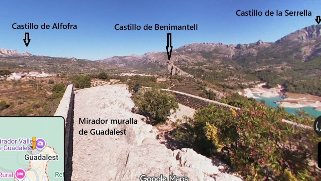 Sin embargo, muchos de esos visitantes, incluido seguramente algún inadvertido lector, ignora que desde el mirador más al noroeste de la muralla de Guadalest se distingue otro castillo a tan sólo 500 metros de distancia. El paseante sólo tiene que divertir su mirada de las calmas aguas turquesas del pantano para observar una loma que sube del pantano hacia su izquierda, en un perfil que nos recuerda la forma triangular de la isla de Benidorm. Allí encima tenemos el castillo de Benimantell. Si miramos al fondo a la izquierda, bajo la sierra Aitana sobre un otero con forma peculiar, que le ha ganado el sobrenombre de la “Cúa del Bacallà”, vislumbramos que allí se asienta el castillo de Alfofra, a más de mil metros de altura. Y si miramos a lo alto, a nuestra derecha, también superando los mil metros de altitud, empinado a caballo entre el Valle de Guadalest y el Valle de Pop, oteamos el castillo de Serrella.