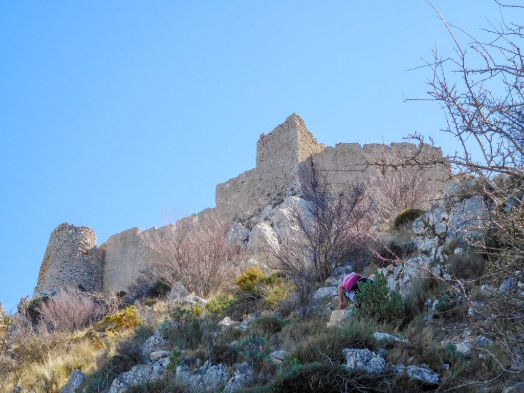 Es un paseo magnífico salir de Guadalest, ir por el camino de Benimantell con una acera casi continua, llegar a la altura del hotel de lujo Vivood, y acercanos hasta el que hoy consta en Maps como Restaurante Contemple (en sus tiempos, Restaurante Castellet), que se encuentra justo debajo del acantilado sobre el que se agazapa, como lagarto tostado por el sol, el castillo musulmán de Benimantell. Para llegar hasta él tendremos que encontrar un difícil sendero a la derecha del acantilado que sube por un estrecho pasillo de piedra y una peligrosa repisa hasta la deslizante falda del farallón.