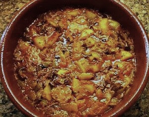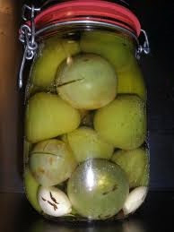También has mencionado anteriormente la salmuera, – continúo interrogando a Roque Ivars-. “ La salmuera es muy importante en la cocina de nuestra comarca por que no es lo mismo que los vinagres que tan alegremente se venden. La salmuera que se hace aquí, por ejemplo, el tomate, no lleva vinagre. Se toman los ejemplares más hermosos que estén verdes (com el suc d’herba/ Traducc. Castell: como el jugo de la hierba). Se cortan en forma de cruz, pero no del todo, sino lo suficiente para que los cuatro trozos del tomate no lleguen a separarse. Se ponen en una vasija pequeña y de boca ancha. Mi abuela tenía para ello una de barro, pero también se puede hacer buena salmuera con recipientes de vidrio. Lo importante es que el grosor del tomate no impida que éste pueda entrar en ella. Se pone agua y sal, algún trozo de limón, unas hojas de algarrobo y otras de caña de las del río; y se tapa con un paño, a ser posible negro atado con una cinta. El paso siguiente es dejarlo a la serena varias noches ¡ Nada que ver con lo que, en ocasiones, se vende como salmuera ! Pero no únicamente esta se hace de tomate, también de raïm de pastor (uña de gato), pencas de cardo y pimiento”.