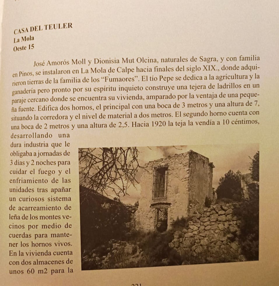 “La Teulera” -propiedad del abuelo y anteriormente del bisuabuelo de Maruja-, al igual que la casa familiar próxima a ésta, se encontraban alejadas del núcleo urbano de Calpe, en la partida Barranc Saltat-La Mola, ambiente rural propicio para encubrir la violencia doméstica. Vivir cerca de la tejería, una zona campestre apartada de todo, era sinónimo de una vida de barro, fuego y soledad, donde los conflictos familiares no dejaban testigos.